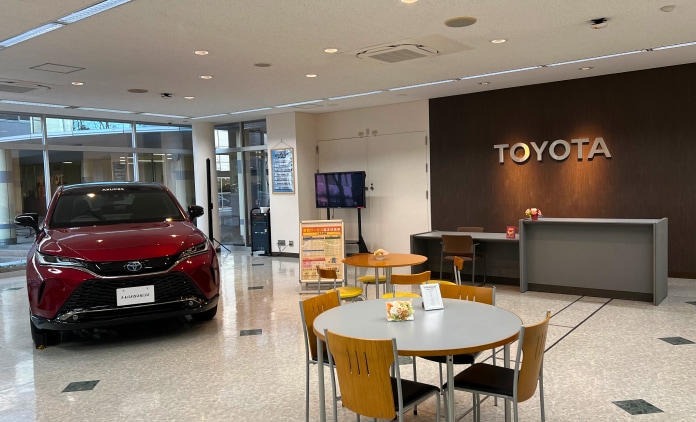 受付やご用命伺い、作業後説明や引渡しなどのお客様応対を実務形式で練習できるショールームをイメージした演習室。ショールームスタッフ科の学生はもちろん、整備系の学生もトヨタ販売店で必要なビジネススキルを身につけるために活用しています。