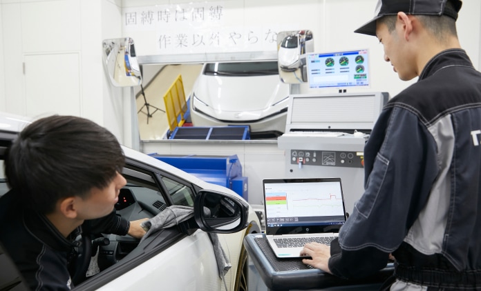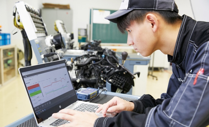 トヨタ独自の車両診断ツール。コンピュータ化された車両の制御システムをチェック・分析し、目には見えないクルマの不調や不具合を確認できます。本校は75台の診断機を保有。「GTS+」になり、より効率的に診断できるようになりました。