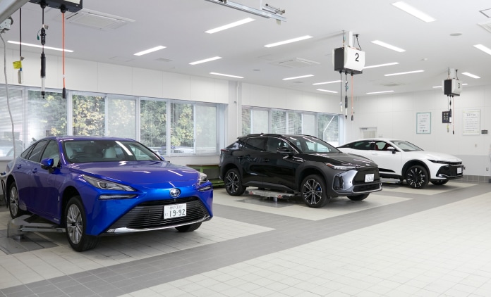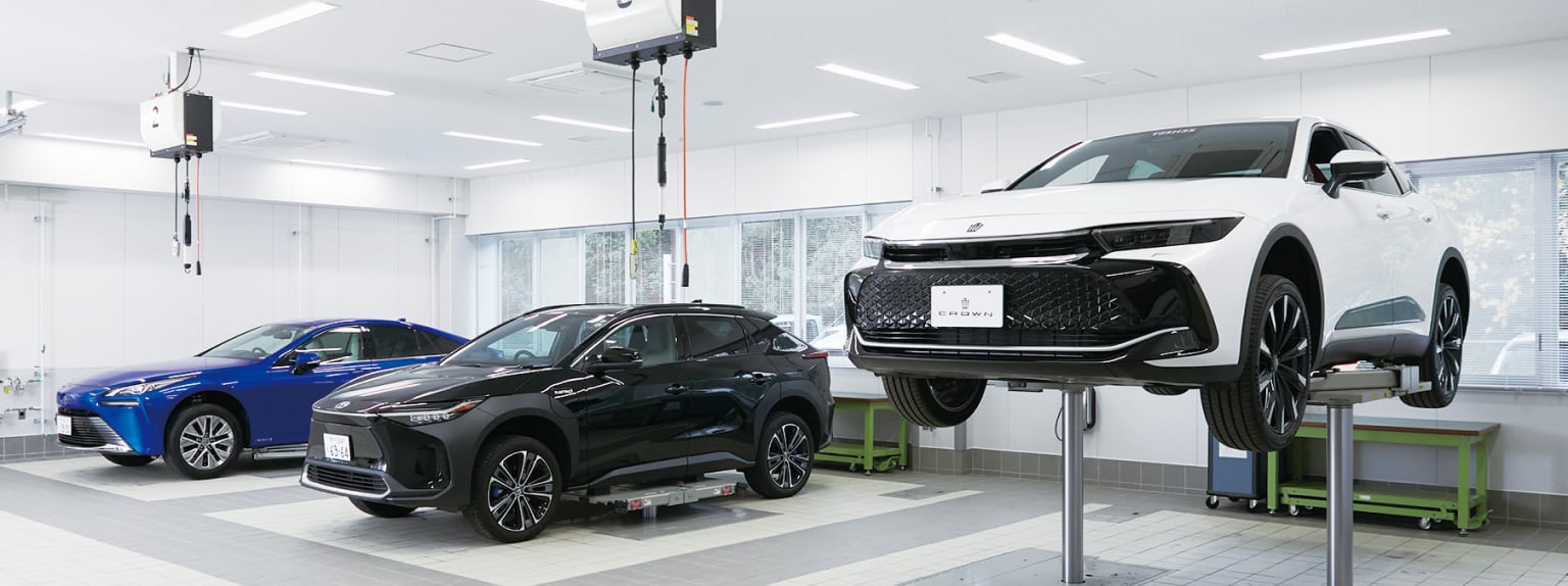 合計40基のリフトを配備。販売店で主流となっているスイングアーム付きプレートリフトに順次更新中。SUVタイプのクルマやBEV、レクサス車までどんなクルマも安全にリフトアップすることができます。