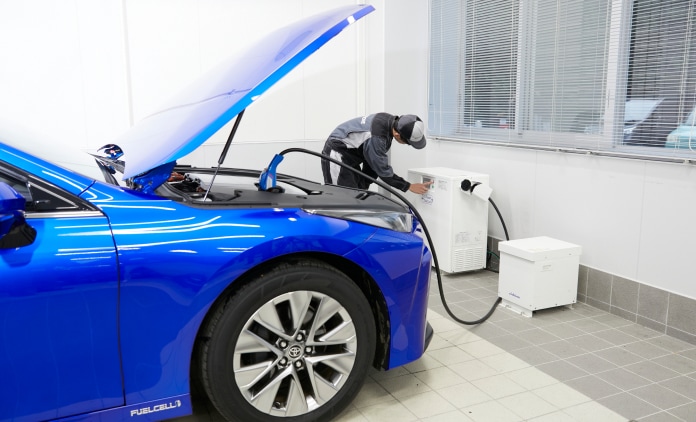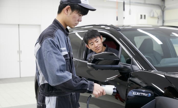 倍速でのBEVへの充電と、停電時には電動車両(BEVやPHEV、FCEV)から建物への電力供給ができるシステム。新技術実習室と校用車駐車場の2か所に設置。