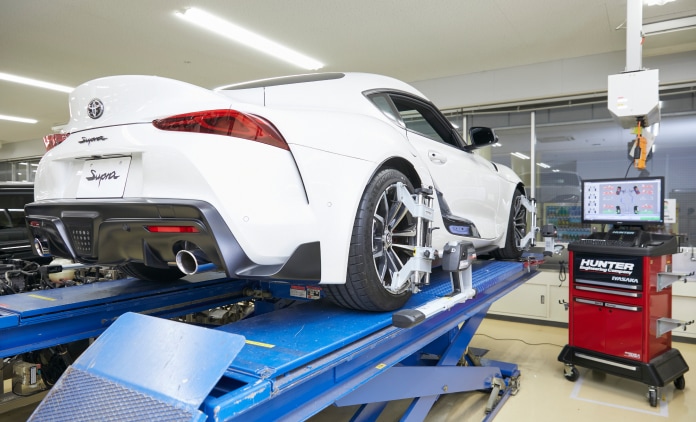 車両がまっすぐ走るようタイヤの取付け位置や角度を測定・調整する装置。自動ブレーキの普及でアライメント調整の重要性が更に高まってきています。