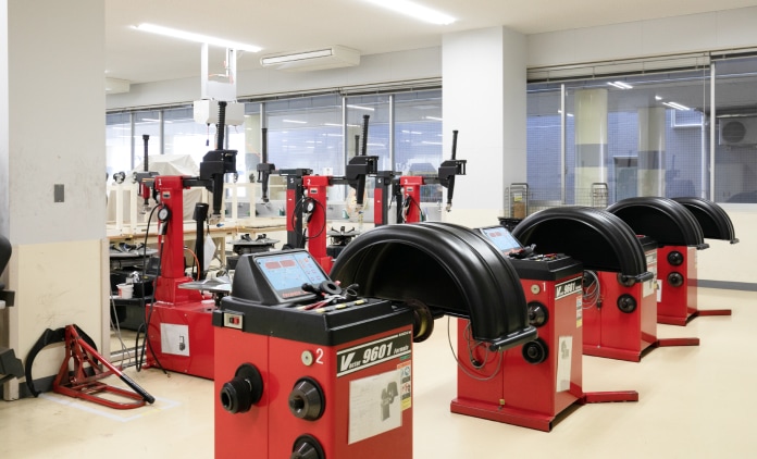 現場で使うことが多くなったタイヤチェンジャーとホイールバランサー。いずれも6基ずつを配備。安全で正確な作業ができるようしっかりと取扱い方法を身につけてもらっています。