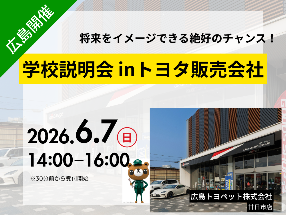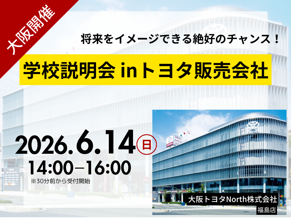inトヨタ販売会社お近くのトヨタ販売会社で現地説明会開催!学校のことや入試のことはもちろん実際に働く方たちの様子を見て将来をイメージできる絶好のチャンス!